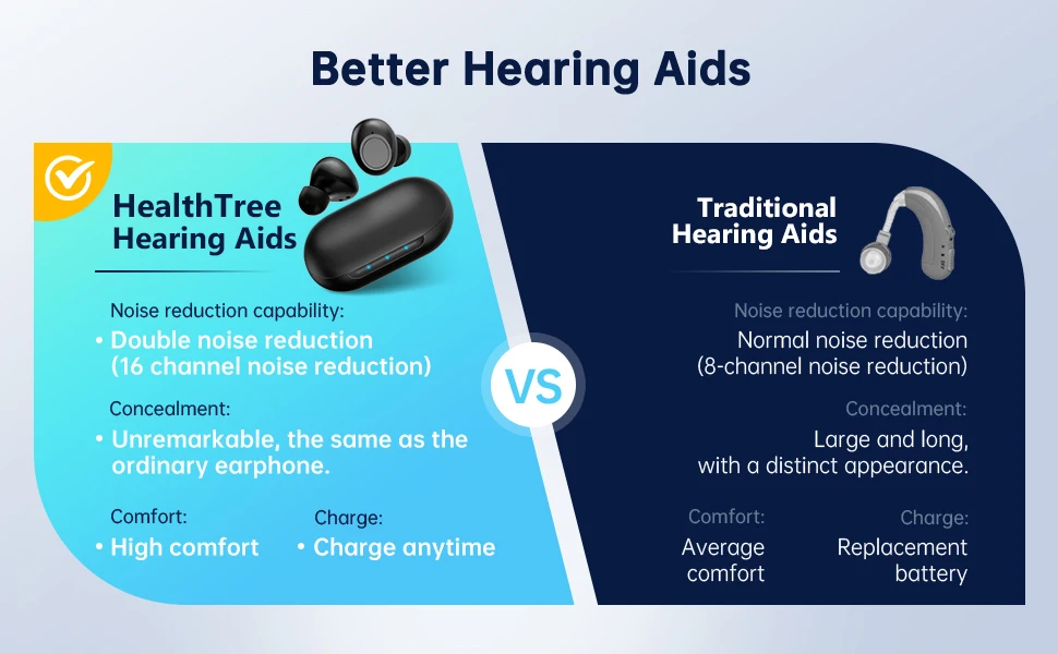 HealthTree hearing aids for seniors rechargeable with noise reducing have a total of 16 channels processed simultaneously. Most ordinary ear hearing aid have only 8 channels of processing capability.