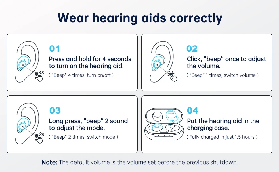 Step 1: Insert the hearing aids into ear canals tightly, and press them for 4 seconds to turn them on;